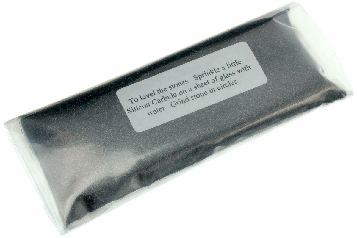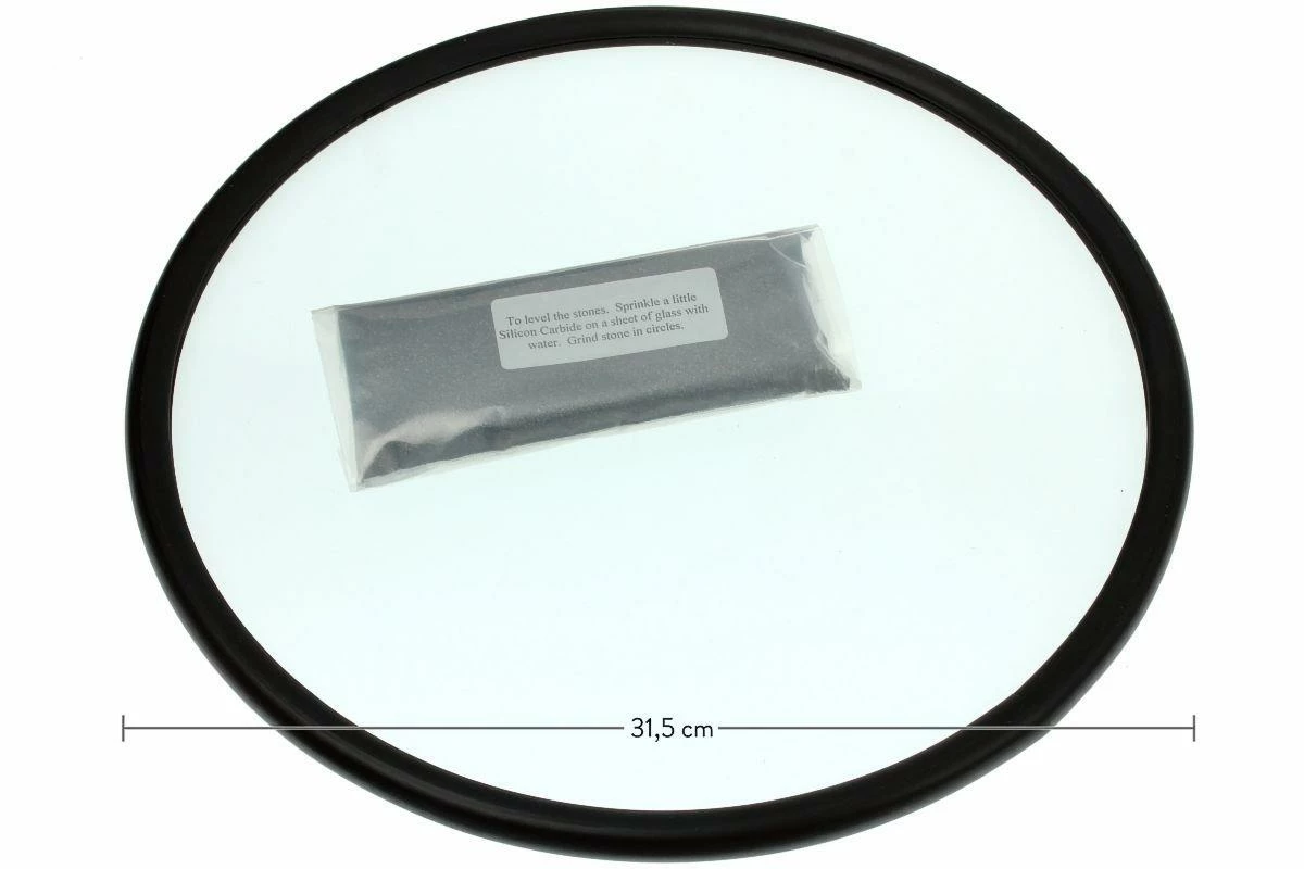 On utilise la plaque de verre en combinaison avec des grains de carbure de silicium extrêmement durs pour aplanir les pierres à aiguiser. Une petite quantité de carbure de silicium est suffisante pour aplanir la pierre. Avec des mouvements circulaires on rend la pierre parfaitement plate. On suit l’évolution en observant la couleur de la pierre. Une pierre de couleur uniforme est parfaitement plate. Si l’on place une autre pierre de côté contre la pierre égalisée, il ne devrait plus y avoir de lumière entre les deux pierres. Maintenir une pierre à égaliser plate permet d’en prolonger la durée de vie.