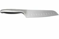 Le santoku Maserin TEGI noir est un couteau élégant et léger. Le santoku est à l’origine un couteau de cuisine traditionnel japonais avec une lame particulière. C’est la version japonaise du couteau de chef. Sa lame, relativement petite, est parfaite pour finement couper les légumes, la viande, le poisson, l’oignon, l’ail et bien sur toutes sortes d’herbes aromatiques.