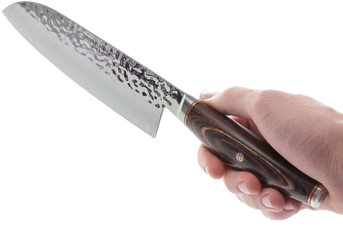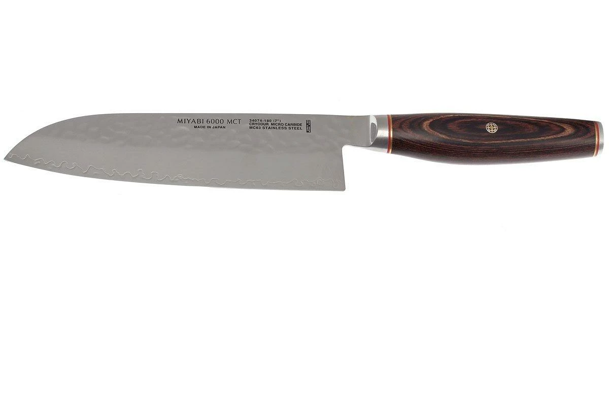 Les couteaux Miyabi 6000MCT sont aussi agréables à utiliser qu’à admirer. Le noyau de ce couteau est en acier Micro-carbure trempé dans du Cryodur d’une dureté de 63 HRC. Avec, en plus, un angle d’aiguisage très fin, ces couteaux sont incroyablement tranchants. La surface martelée à la main selon la technique appellée Tsuchime est à couper le souffle. Les cavités créées empêchent aux aliments de coller sur la lame. Le manche en bois de cocobolo stabilisé a une forme très ergonomique. Le rivet en mosaïque complète ce superbe design.