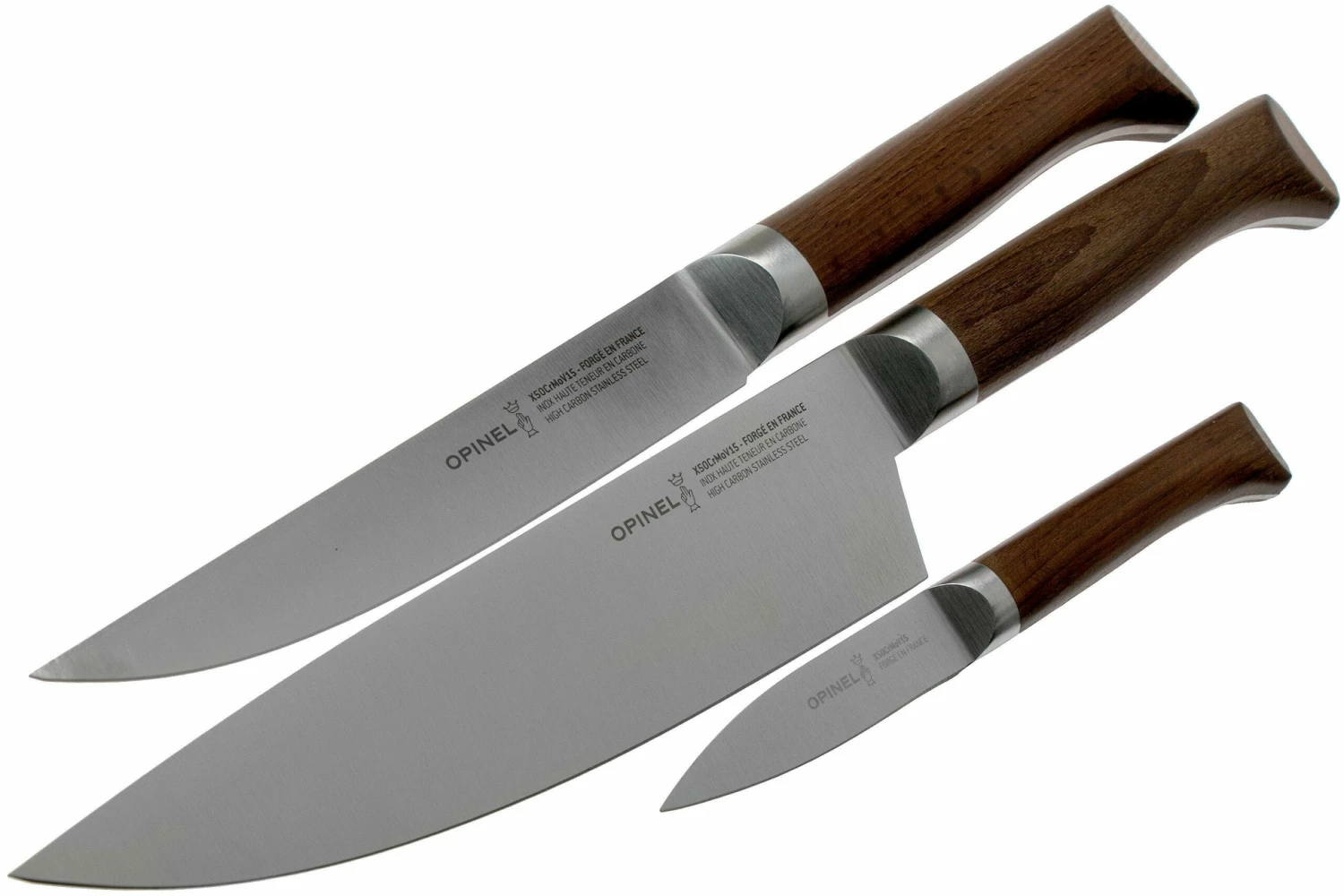 Ce set de trois pièces de la gamme Les Forgés 1890 Opinel comporte un couteau de chef de 20 cm, un couteau à viande de 16 cm et un couteau à éplucher de 8 cm. Un bel ensemble avec trois couteaux de cuisine très utilisés. Légumes, fruits, herbes, viandes, poissons : ces couteaux de qualités n’en feront qu’une bouchée 1
