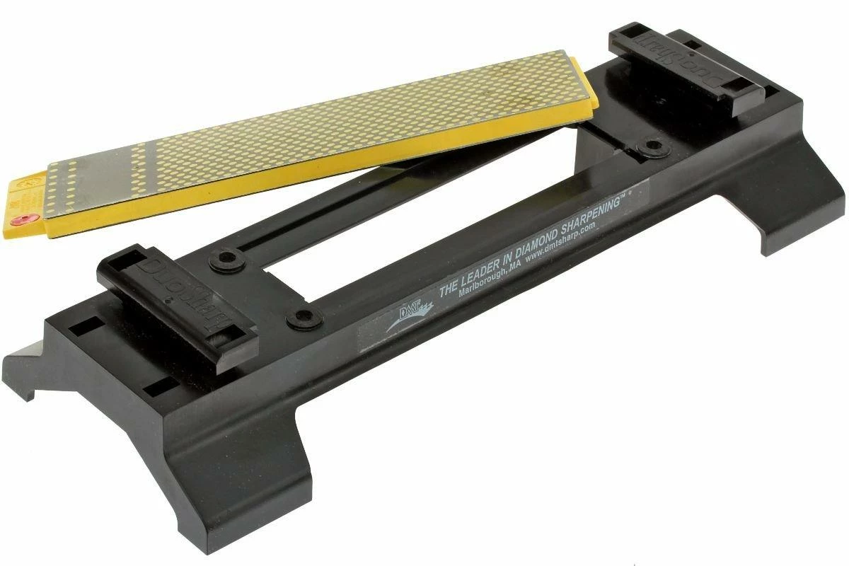 La DMT Harcoat Duosharp Plus WM8EF est une pierre à aiguiser diamant grand format biphasée parfaite pour aiguiser les grands couteaux. Une partie de la surface d’aiguisage est pourvue du fameux motif à pois caractéristique de DMT, une partie est occultée. Cela permet d’aiguiser des petits ciseaux à bois ou autres outils de petite taille sans qu’ils se coincent dans les alvéoles. Un côté de la pierre arbore une granulométrie fine, et l’autre, une granulométrie extra fine. On reconnaît la granulométrie aux bandes rouge et verte.