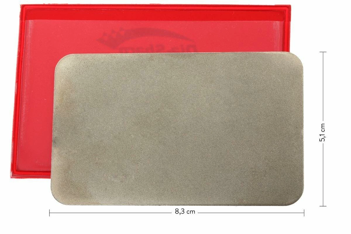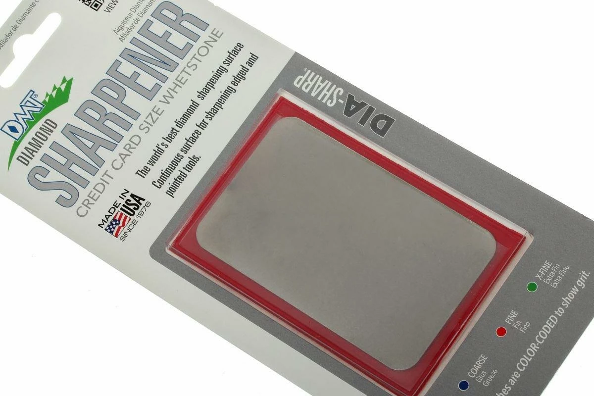Cette pierre à aiguiser compacte à surface d’aiguisage diamantée peut être glissée dans un portefeuille grâce à son format de carte de crédit. Elle est donc parfaite pour qui veut toujours avoir des couteaux bien aiguisés. Ces pierres ne sont pas pourvues du fameux motif à pois de DMT. On peut ainsi aiguiser des petits ciseaux à bois ou autres objets de petit format sans qu’ils risquent de se coincer dans les trous.