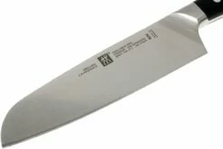 Santoku de la série Alpha Olivier de Güde. Ce santoku est doté d’alvéoles qui empêchent les aliments de rester coller à la lame. Vous trouverez plus d’infos à ce sujet ici.
