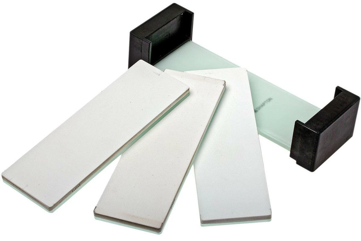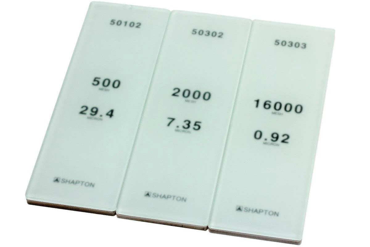 Ce set de pierres à aiguiser Shapton Glass Stone sert à redonner et à maintenir le tranchant des couteaux dont vous vous servez le plus. La taille de grain 500 sert à redonner du tranchant aux couteaux émoussés. La taille de grain 2000 va redonner du tranchant aux couteaux relativement tranchants et les aider à le préserver. Avec la taille 16 000, on enlève les toutes petites rayures et irrégularités du tranchant, pour une expérience de coupe incroyable !